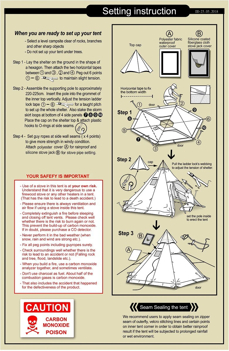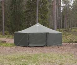 Il est équipé d’une trappe de cheminée pour pouvoir utiliser le tipi avec un poêle à bois. Un velcro « Oxford Patch » permet au tuyau de sortir de l’abri sans faire fondre le tissu environnant. Il est cependant nécessaire d’utiliser un collier thermique pour faire le tour du conduit de cheminée afin de protéger le patch Oxford et le tissu. Le poêle à bois n’est pas fourni avec l’abri. Vous devez utiliser votre propre solution. Si vous n’utilisez pas de poêle à bois, un patch de protection permet de fermer hermétiquement la trappe de la cheminée.