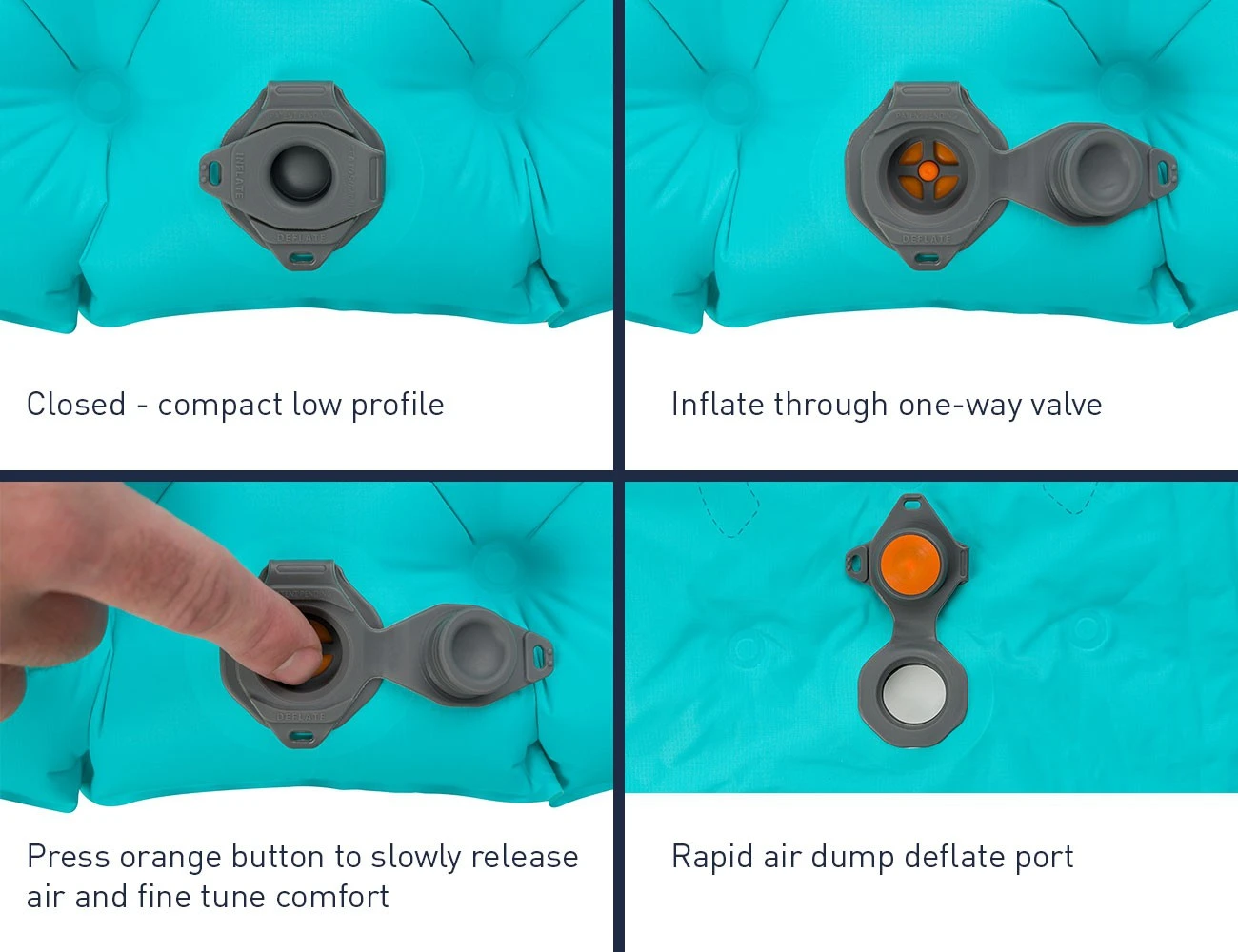 Les 2 valves multifonction sont plates et compactes. Elles disposent de clapets anti-retour et d’une fonction de gonflage et dégonflage. Le matelas est livré avec le sac de rangement et de gonflage Airstream Pumpsack.