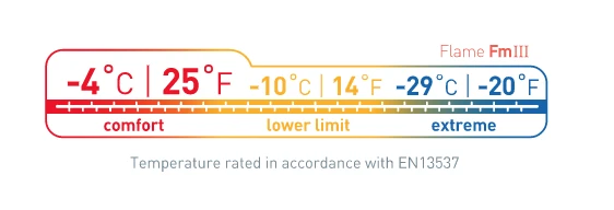 Confort : le Flame FmIII est garni de 440 g (taille Regular) de duvet d’oie européen 850 cuin, répartition 90/10, ce qui correspond à une température confort de -4°C (selon la norme européenne EN13537). L’enveloppe intérieure en nylon 7 deniers et extérieure en nylon léger 10 deniers est agréable au touché.